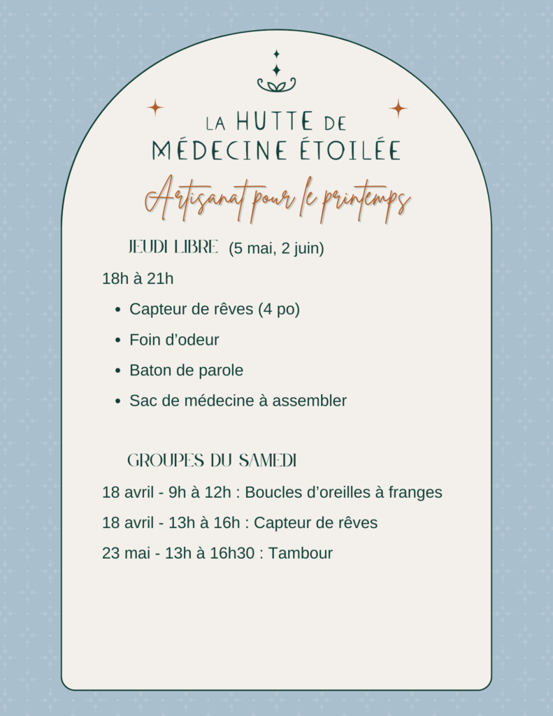 Bienvenue à la Hutte de médecine étoilée, un espace de ressourcement, de culture et de bien-être inspiré des traditions des Premières Nations situé au cœur de Wendake. Ici, chaque visite est une invitation à renouer avec soi, avec la nature et avec les savoirs ancestraux.